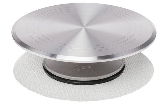 Use to decorate cakes. Stainless steel ball bearings make for smooth rotation. Soft plastic cap on base prevents sliding. 12" diameter top. Height 4". 1 Non-Slip Pad included.