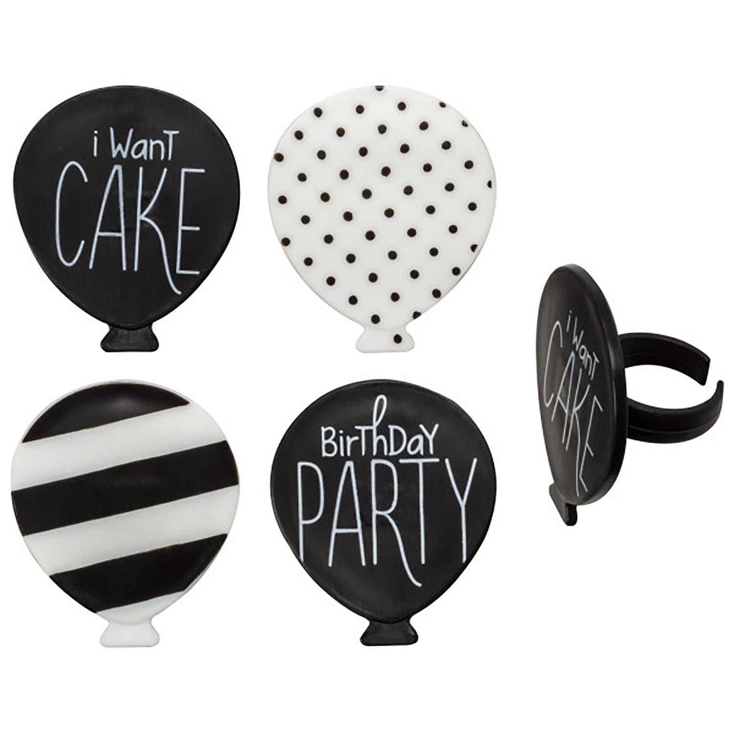 Give the birthday desserts a black and white theme with these rings. Great for cupcakes, donuts, or even finish off the look of a cake. Made with food-safe plastic.