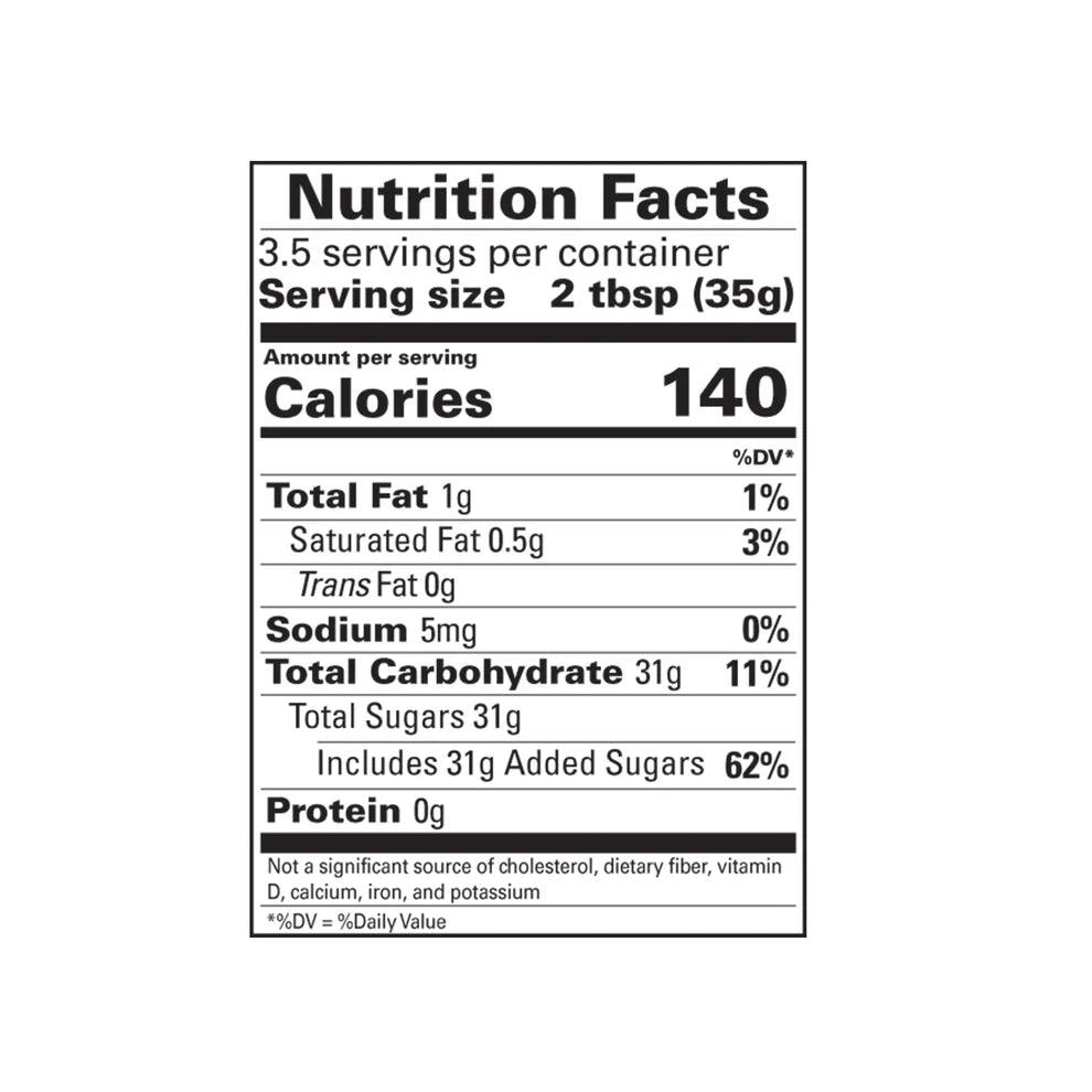 Ingredients: Sugar, corn syrup, water, canola oil, palm oil, natural and artificial flavors, cellulose gum (thickener), modified corn starch, potassium sorbate (preservative), glycerin (humectant), acetic acid (preservative), pearlescent pigment. May contain one or more of the following: caramel color, blue 1, red 40, yellow 6, red 3, yellow 5.