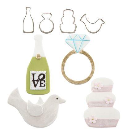 Make quick and adorable accents for cookies, cupcakes and cakes. Set contains four stainless steel cutters: ring (1 9/16" x 2 3/16" or 40mm x 56mm), champagne bottle (1 1/8" x 2 13/16" or 29mm x 71mm), cake (1 11/16" x 2 7/16" or 43mm x 62mm) and dove (2 3/4" x 1 7/8" or 70mm x 48mm).